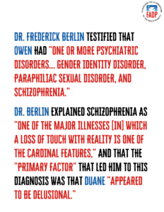 Dr. Frederick Berlin testified that Owen had “one or more psychiatric disorders… gender identity disorder, paraphiliac sexual disorder, and schizophrenia.” Dr. Berlin explained schizophrenia as “one of the major illnesses [in] which a loss of touch with reality is one of the cardinal features.” And that the “primary factor” that led him to this diagnosis was that Duane “appeared to be delusional.”