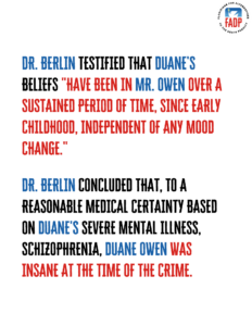 Dr. Berlin testified that Duane’s beliefs “have been in Mr. Owen over a sustained period of time, since early childhood, independent of any mood change.” Dr. Berlin concluded that, to a reasonable medical certainty based on Duane’s severe mental illness, schizophrenia, Duane Owen was insane at the time of the crime.