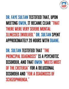 Dr. Faye Sultan testified that, upon meeting Owen, it became clear “that there were very severe mental illnesses involved.” Dr. Sultan spent approximately 20 hours with Duane.