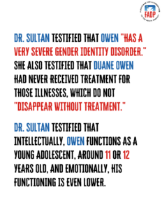 Dr. Sultan testified that Owen “has a very severe gender identity disorder.” She also testified that Duane Owen had never received treatment for those illnesses, which do not “disappear without treatment.”