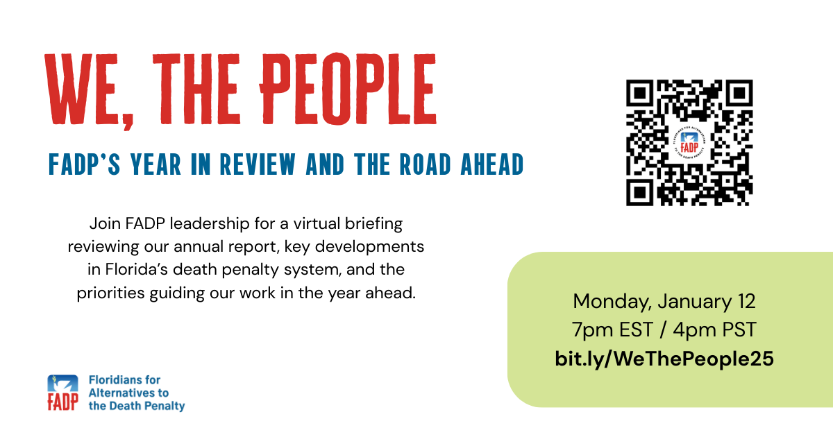 Next Monday, January 12, we’re hosting a virtual Zoom briefing at 7:00 p.m. ET to take a closer look at what 2025 revealed about Florida’s death penalty system — and to talk through what we’re watching in the year ahead.