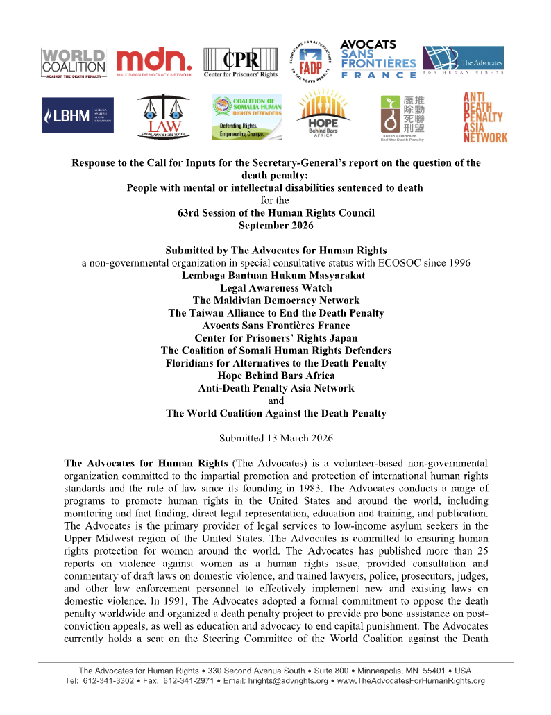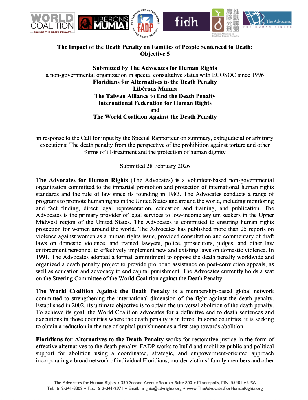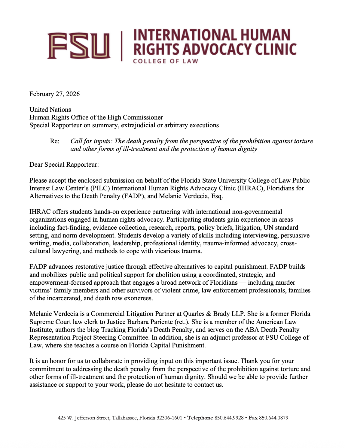 In partnership with the Public Interest Law Center at Florida State University College of Law, Quarles & Brady LLP, and The Advocates for Human Rights, these submissions were directed to international human rights authorities, including the Special Rapporteur on Extrajudicial Executions.
